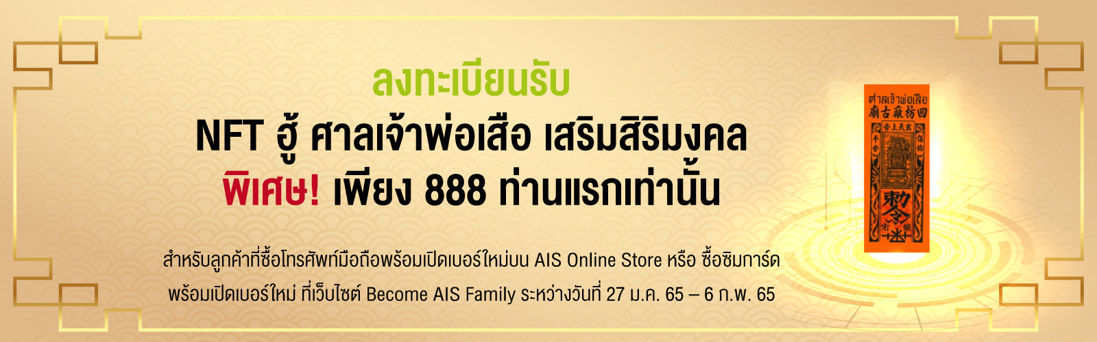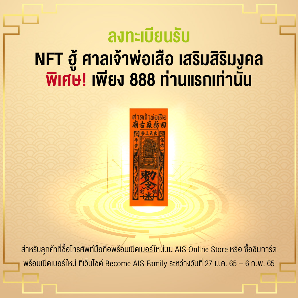 - • ของสมนาคุณ “NFT ฮู้ศาลเจ้าพ่อเสือ” เป็นสิทธิพิเศษสำหรับลูกค้า AIS ที่ร่วมสนุกกับ “ศาลเจ้าพ่อเสือเสมือนจริง” ผ่านช่องทางการลงทะเบียน ระหว่างวันที่ 27 มกราคม 2565 – 10 กุมภาพันธ์ 2565 และลงทะเบียนรับสิทธิ์ในเว็บไซต์ https://www.ais.th/promotion/chinese-new-year-themall เท่านั้น